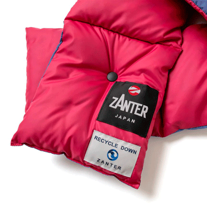 身生地は余った生地を使用し、中綿には「RECYCLE DOWN」を採用。
