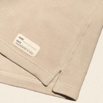 特殊な編機で編んだ素材のため、表面はセーターのような表情でありながら裏面は天竺編みになっている。
